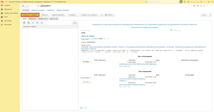 6. Завершите работу с документом, нажав кнопку «Записать и закрыть» (Рисунок 7).