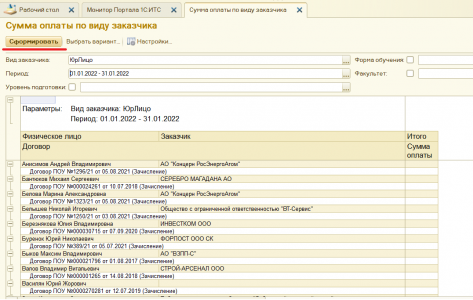 Отчет "Сумма оплаты по виду заказчика" отображает сколько заплатили за обучение по виду заказчика.