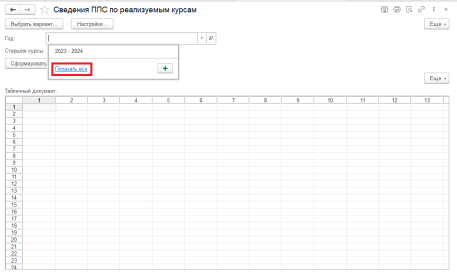 Для формирования отчета «Сведения ППС по реализуемым курсам», сначала заполните поле «Год». Нажмите на стрелку, затем Показать все и в списке выбрать необходимый год (рис.2).