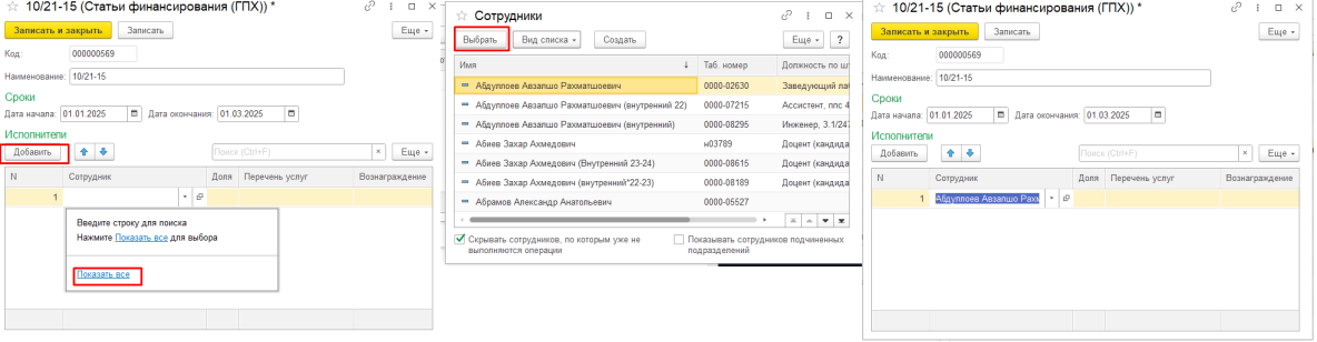 4) Так же в данном окне необходимо заполнить таблицу с сотрудниками. Для этого сначала нажимаем кнопку "Добавить", в таблице появляется новая пустая строка. В данной строка кликаем два раза по столбцу "Сотрудник" и выбираем "Показать все". Далее появляется окно с выбором сотрудника, выбираем необходимого сотрудника и нажимаем кнопку "Выбрать" (рис. 3).