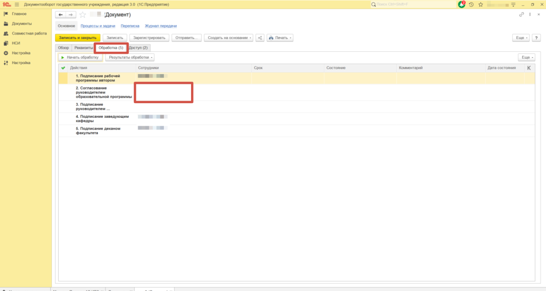 Затем нужно перейти на вкладку «Обработка» (Рисунок 5) и дважды нажать на поле «Сотрудники» в строке «Согласование руководителем образовательной программы».